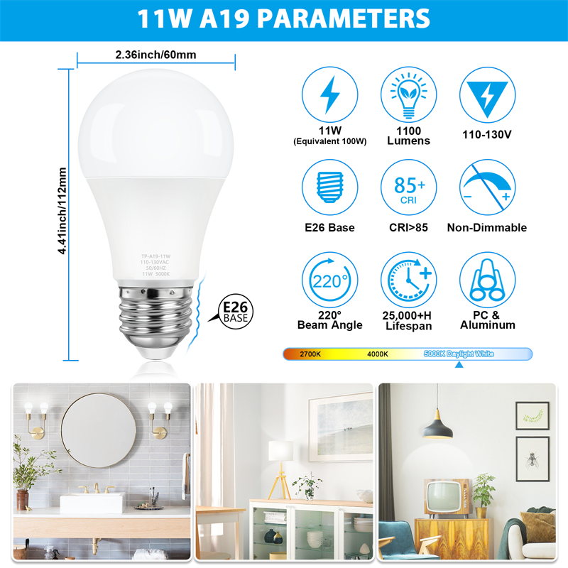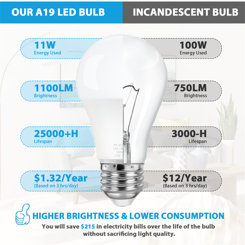 Long Lifespan -- 11W A19 LED bulbs give out the same brightness as 100W incandescent bulbs, greatly reducing power consumption. Low power consumption provides over 25,000 hours lifespan, reducing re-lamp frequency.