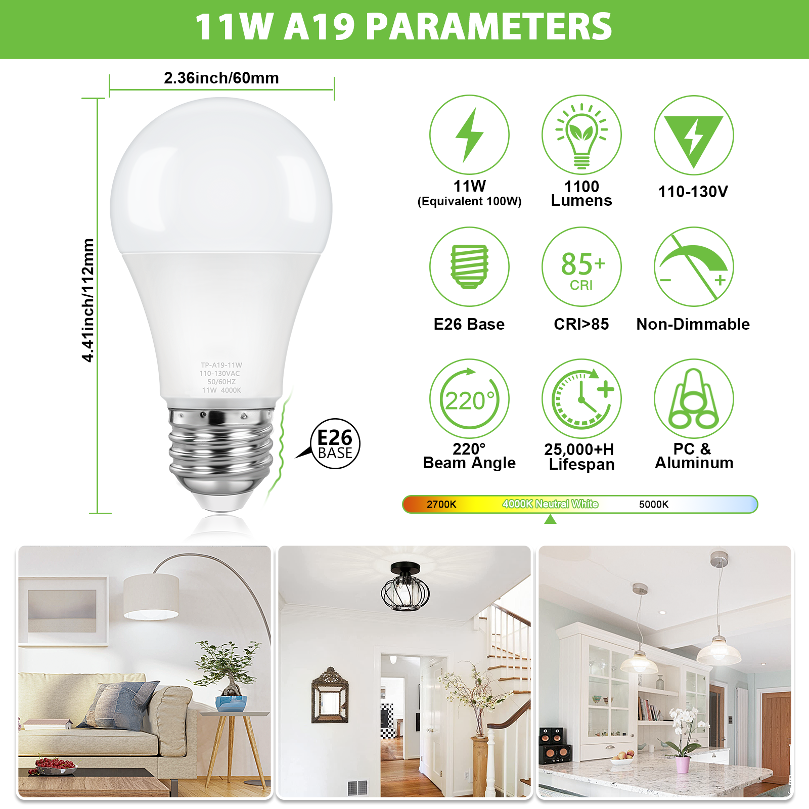 💡【Super Bright & No Delay】Designed with the latest LED source technology, this A19 LED light bulb has a high output of up to 1100 lumens. It will emit full brightness at neutral white 4000k with 220-degree light disbursement. No delay and no dark space, the neutral white A19 led bulbs will instant on to create a neat and clarity atmosphere, which makes it perfect for home lighting or commercial lighting.