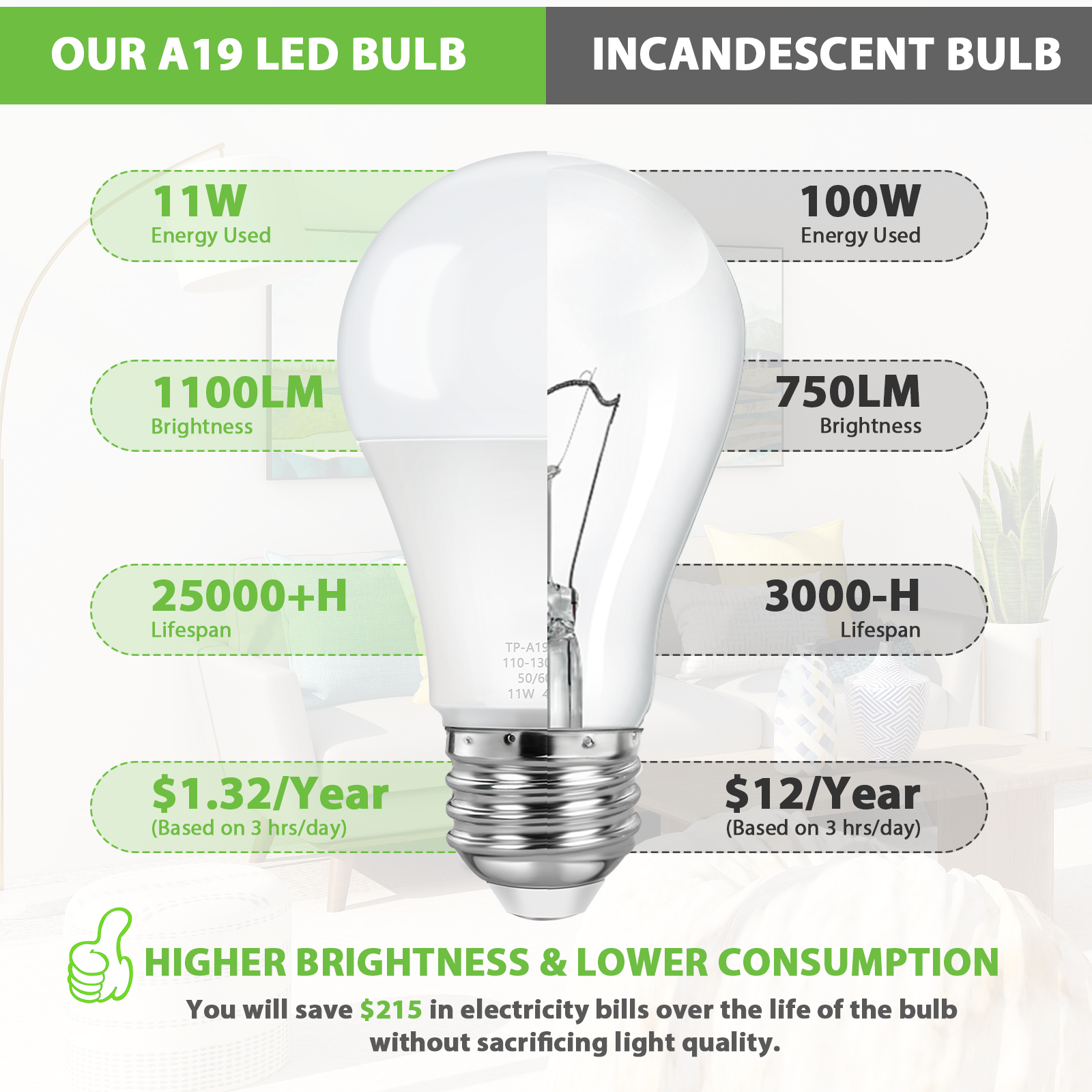 💡【Energy Efficient & Money Saving】Equipped with energy-efficient LED chips, the 11W A19 led bulbs will reduce heat output and save over 90% on the electricity bill of lighting, which makes it an economical alternative to 100W incandescent bulbs. Unlike normal incandescent bulbs, our A19 100 watt LED light bulb has a long-lasting lifespan of up to 25,000 hours, largely reducing your energy bills of frequent re-lamping while providing the same lighting quality.